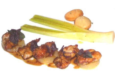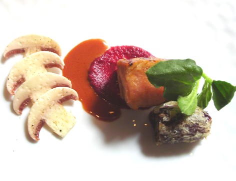 Dolce e salato Come Platone nel Parmenide dimostra che l'uno è in realtà molti, sono ugualmente molteplici i sapori del lombo [*asterisco gourmet] di maiale iberico scottato sui carboni alla griglia, accompagnato dal dattero farcito e fritto, da un “curry rosso alle barbabietole” e dal ventaglio di gemelle fettine di funghi champignon.