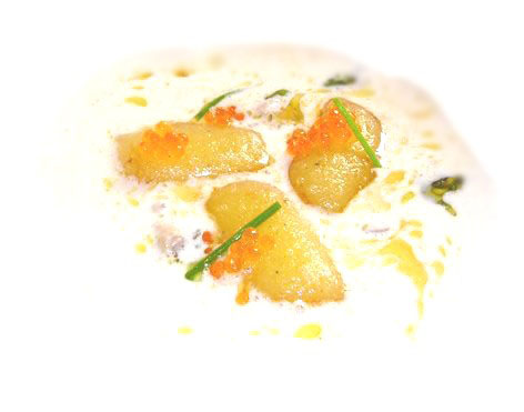 Freddo e caldo Lo specchio sembra carpire l’identità della Crema di burrata nella quale gli gnocchi di acqua di patate lavorati a freddo nuotano pigri insieme alle ostriche, sferzati dal sapore deciso delle uova di trota. Le note marine dell’ostrica sono potenziate dal vino che sfuma l'intensa burrata e contemporaneamente la fa sembrare ancora di più burrosa. Scarto e primizia Si specchiano nel loro doppio perfettamente replicato le Animelle gemelle di agnello alla canna da zucchero, adagiate su focaccine al rosmarino, tiepido di rape e vivacizzate dai porri.