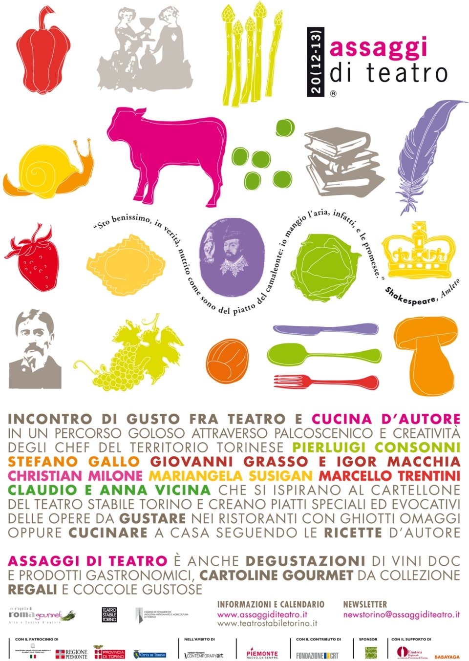 | Assaggi di Teatro 2010-2011 è un incontro di gusto fra Roma gourmet e Teatro ideato dalla giornalista Maria Luisa Basile e realizzato da Roma gourmet in collaborazione con Comune di Torino, Fondazione del Teatro Stabile di Torino, Camera di Commercio di Torino, con il contributo di Fondazione CRT e con il supporto di Enoteca Regionale vini provincia di Torino. Patrocini: Ministero Politiche Agricole Alimentari e Forestali, Regione Piemonte, Provincia di Torino. Sponsor: Lavazza, Forcella. Sponsor tecnico Babayaga |