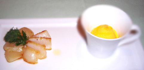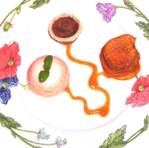 Infine, un arrendevole lingotto di cioccolato gianduia precede la variazione di cachi che gioca nelle tre diverse consistenze con i decori floreali del piatto, assecondando il gusto di Agata e della figlia Maria Antonietta di servire la pittura nel piatto. |