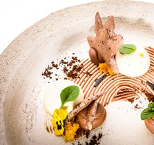 | Giovanni Grasso e Igor macchia dedicano per Assaggi di Teatro al trasformismo di Brachetti… la Grolla: bavarese al caffè, arancia, anice stellato e meringhe al cacao | ||||