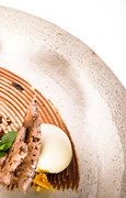 Tutti conosciamo la “Grolla” grazie a un rito della tradizione valdostana che l’ha resa il simbolo dell’amicizia per antonomasia: l'atto di bere in compagnia condividendo un unico calice rinsalda i legami. L’usanza ha origini lontane che risalgono alla Grecia dell'età omerica e all’antica Roma e, in tempi relativamente più recenti, anche al Canavese. Nel Cinquecento infatti i luoghi dove gli chef Giovanni Grasso e Igor Macchia creano oggi le loro prelibatezze erano un punto di ritrovo per le persone di tutto il paese. Stare insieme, riunirsi, condividere allegria sembrano anche i temi ispiratori degli spettacoli di Arturo Brachetti. Coinvolgente, vero, effervescente e umile al tempo stesso, Brachetti è la personificazione dell’artista capace di attirare ed entusiasmare le persone più diverse. Assaggi di Teatro gli tesse una lode gourmet e un legame ulteriore, dedicandogli la personale interpretazione della “Grolla” degli chef Giovanni Grasso e Igor Macchia. Da calice capace di unire le persone, incoraggiando la condivisione e la diffusione di valori comuni, la trasformano, con la stessa squisita tecnica che caratterizza il trasformismo di cui Brachetti è maestro, in un morbido girotondo di caffè, arancia, anice stellato e meringhe al cacao. In un delicato mutamento di sapori. (MLB) |