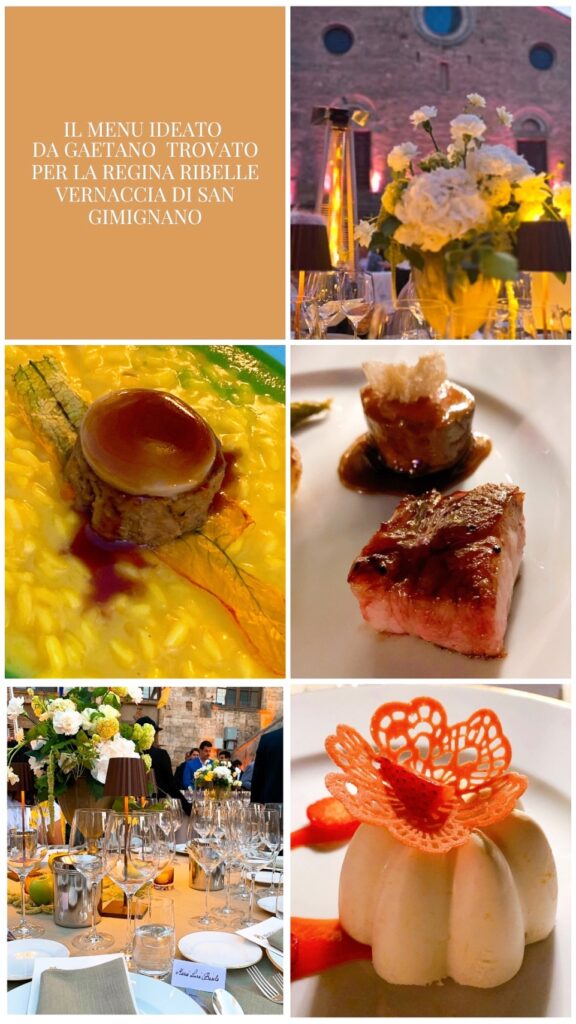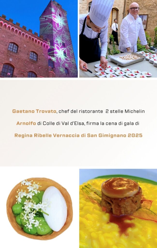 Da alcuni anni la Vernaccia di San Gimignano ha un suo evento dedicato, nato per farla conoscere agli appasisonati di vino e alla stampa specializzata: Regina Ribelle. Degustaizoni, masterclass, visite alle cantine hanno caratterizzato l’edizione 2025 di Regina Ribelle, culminata nella cena di gala a cura dello chef Gaetano Trovato del ristorante 2 stelle Michelin Arnolfo di Colle di Valle d’Elsa. Scenario della raffinata cena, la Piazza del Duomo di San Gimignano cirondata dalle torri millenarie, a sottolineare il legame fra la storia del vitigno e i luoghi di produzione. Nel menu della cena ha brillato il piatto di Cinta senese con asparago e cippollotto primaverile, preceduto da Risotto Riserva San Massimo con zafferano, ossobuco e zucchina in fiore e a conclusione un dessert alla fragola, caramello e vaniglia. Il tutto preceduto e seguito da sofistificati amuse bouche serviti espressi in un itinerario di postazioni nella corte del Palazzo del Popolo e piccola pasticceria, Nel calice la Vernaccia di San Gimignano DOCG in diverse annate di svariati produttori.