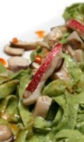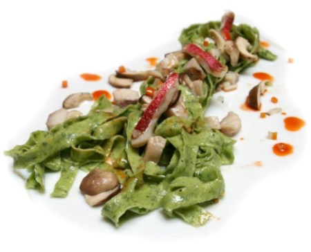 Treccia di tagliatelle verdi con ragù di triglie, funghi porcini