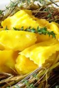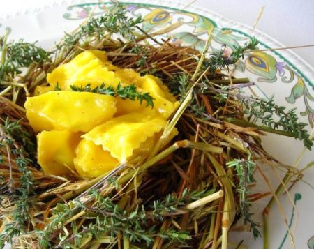 Utilizzando il fieno del canovaccio, creare dei nidi da posizionare nei singoli piatti e servire all’interno gli agnolotti.