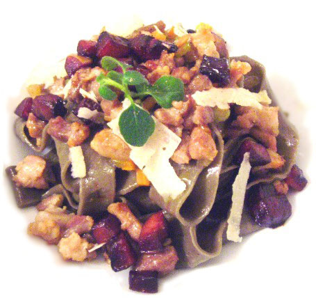 Pappardelle al nero di seppia con ragù di cinghiale pera cotta nel vino rosso e pecorino romano di Giulio Terrinoni