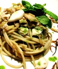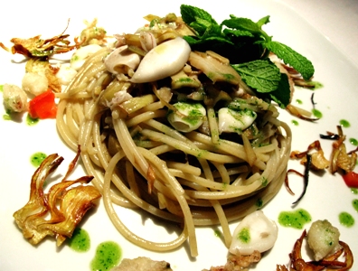 500 gr di linguine di Setaro (Napoli); 400 gr di Calamaretti puliti senza penna né occhi; 2 carciofi romaneschi; 4-5 foglie di menta; 1 litro di brodo vegetale (cipolla, sedano, carote, prezzemolo); 2 spicchi d’aglio; ½ peperoncino; Olio Extra Vergine d’Oliva