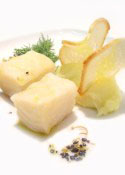 Il Baccalà è il merluzzo essiccato e salato... dallo spagnolo Bacalao e questo dal fiammingo Bakkeliauv derivato metatico dell'olandese Kabeljav. Procedimento per il baccalà In ogni piatto disporre due tranci di baccalà lessato irrorato con l'olio. Accanto disporre una cucchiaiata di purea di patate decorata con alette di pane tostato e un ciuffetto di aneto. A piacere, servire con baccalà mantecato. Ingredienti per la presentazione