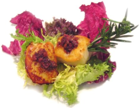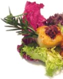 Adagiare sul piatto qualche foglia di insalata e posarvi sopra il baccalà grigliato caldo; irrorare con la salsa e decorare con un rametto di rosmarino.