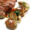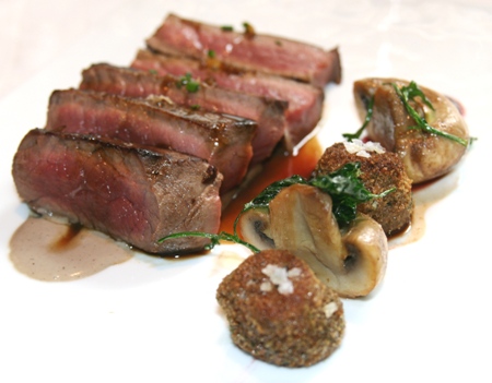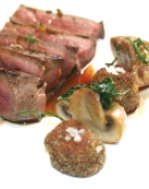 Servire il manzo tagliato a fettine, contornato dai funghi saltati e dalla salsa di rapa rossa.