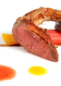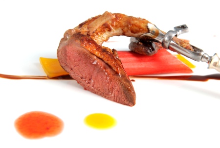 Disporre nel piatto la gelatina di frutta, stendere una riga di salsa di piccione, disporre il piccione e completare con gocce di succo di fragole e di frutto della passione.