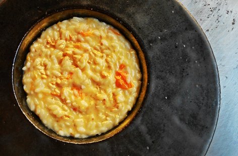Tomato rice recipe Process for tomato Blend washed tomatoes and strain them to obtain a clear liquid. Serves 4 1 kg ripe tomatoes Process for rice Toast the rice and cook with the tomato liquid, stirring constantly. When rice is cooked, add butter and cheese. Ingredients 320 gr Carnaroli rice; 60 gr butter; 80 gr Grana Padano cheese; extravirgin olive oil Presentation Garnish rice with gold dust. Ingredients Gold powder for decoration |
