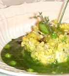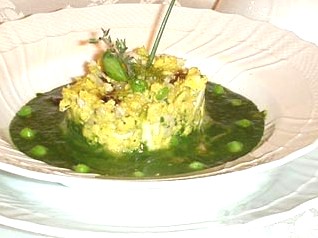 Lessare una dozzina di asparagi, i pisellini e le fave. Mescolare 4 uova con 1 cucchiaio di erba cipollina, 1 cucchiaio di prezzemolo tritato, maggiorana, sale e pepe e i bianchetti. Cuocere il composto a fuoco basso in una padella antiaderente, mescolando continuamente e facendolo addensare.