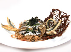 Nella rete dello chef Massimo Riccioli (ristorante La Rosetta) cadono gli Spaghetti con acciughe fritte e marinate Opulenti ...ricetta |