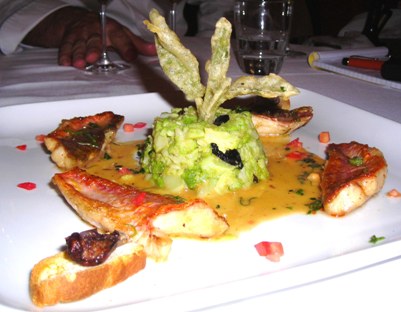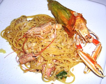Le alici, in passato piatto povero e popolare, diventano una prelibatezza grazie alla mano felice e leggera dello Chef Massimo Riccioli che le serve marinate su crostini insaporiti con i capperi di Serraghia da tuffare nelle fresche profondità del vino bianco che con i suoi profumi di mallo di mandorla regge bene la marinata di aceto e peperoncino fresco delle alicette fresche appena pescate. Le note croccanti della fragrante fritturina di paranza di Anzio accompagnata dal succo di pomodori tardivi intrecciano sul piatto un girotondo di profumi e sapori che inebria, esaltati dal vino che regge perfettamente il gazpacho e accompagna bene il pesce cotto velocemente e fritto, sgrassandolo. Dopo il sorbetto al sedano le papille sono pronte all’esplosione di sapori degli spaghetti con scampi, fiori di zucca e pecorino romano e le vertigini raggiungono il culmine con le triglie alla salvia con broccolo romanesco - piatto dedicato da Massimo Riccioli ad Assaggi di Teatro - cullate dalle note persistenti dello Chardonnay.