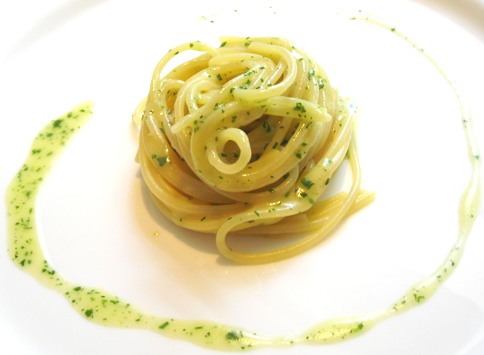 | Gli spaghetti e la pasta lunga si mangiano esclusivamente con la forchetta. Non si tagliano con il coltello, né si usa il cucchiaio per agevolarsi. La forchetta deve essere tenuta un po' inclinata orizzontalmente e si devono arrotolare pochi spagetti alla volta, in senso orario, in modo da ricavare un boccone moderato e senza fili bavosi che pendono. Foto: Spaghetti degli Chef Alfonso Iaccarino e Vincenzo Castaldo |