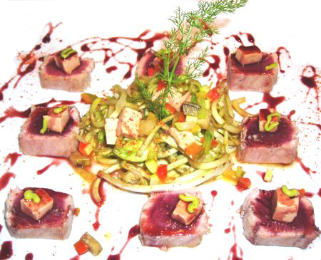 Il mefistofelico Don Gaetano nato dalla penna di Leonardo Sciascia biasima, in una pagina di Todo modo, "coloro che non si curano di ciò che mangiano" e definisce eroe, paragonandolo a Catone, il cuoco e maestro di cerimonie francese Francois Vatel: suicidi entrambi, il primo “per la libertà che se ne andava” e il secondo “per il pesce che non arrivava”. La mano vaga indecisa ma piena di desiderio sulle crude delizie della imponente piramide di ostriche, faraonico omaggio al palato raffinato del moderno Lucullo e che, per essere un "cibo del tutto insoddisfacente per il lavoratore”, ma “perfetto per il sedentario, come cena prima di una bella dormita” (A.J. Bellows), più che alla penichella invitano i sensi dei partecipanti al ritiro spirituale ad accendersi. E li preparano al pesce che i gourmand immediatamente associano alla Sicilia: il tonno, qui appena scottato ma decisamente caduto in amore per un’oca, anzi per il suo fegato grasso. Gli fanno compagnia un’insalata di tenere puntarelle romane irrorate di aceto di Marsala e le eleganti sensazioni di glicine e prugna gialla del vino bianco delicato nella leggera speziatura di pepe bianco, frutta secca e agrumi.