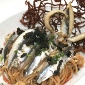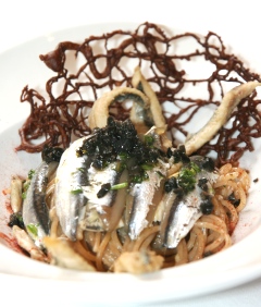 | ...Spaghetti con girotondo di acciughe marinate e fritte e finto caviale di olive e capperi “La pesca migliore / è quando vedi il pesce tagliar l’acqua d’argento / con i suoi remi d’oro per inghiottire / avidamente l’esca traditora”… i versi rivolti a Ero dalla damigella Orsola rappresentano un’esca irresistibile per lo chef di cucina marinara Massimo Riccioli che interpreta la commedia musicale dipanando il garbuglio di amorose trame e simmetrie con un’altrettanto vivace matassa di spaghetti. Volteggiando nel piatto insieme alle alici e all’illusione di caviale creata dai coriandoli di capperi e olive nere, i vermicelli fanno esclamare “quivi s’affollano le voglie tenere, delicate…”! (MLB) |