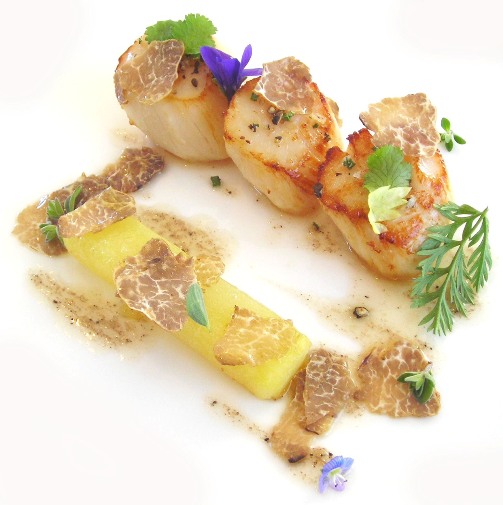| Cappesante, mattoncino di patate, tartufo bianco, erbe e fiori primaverili |
